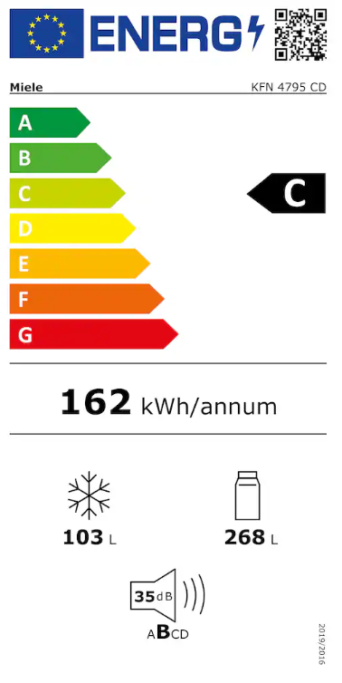 Modèle libre, Blackboard edition, Design sans poignée, Click2open / SoftClose, Dimensions hxlxp: 2015 x 597 x 682 mm, Capacité utile totale: 371 l,, zone de réfrigération: 268 l,, zone de congélation 4 étoiles (NoFrost): 103 l, Eclairage intérieur à LED / DailyFresh, Commande SensorTouch / DynaCool / Miele@home, Energylabel: C / Charnières à droite