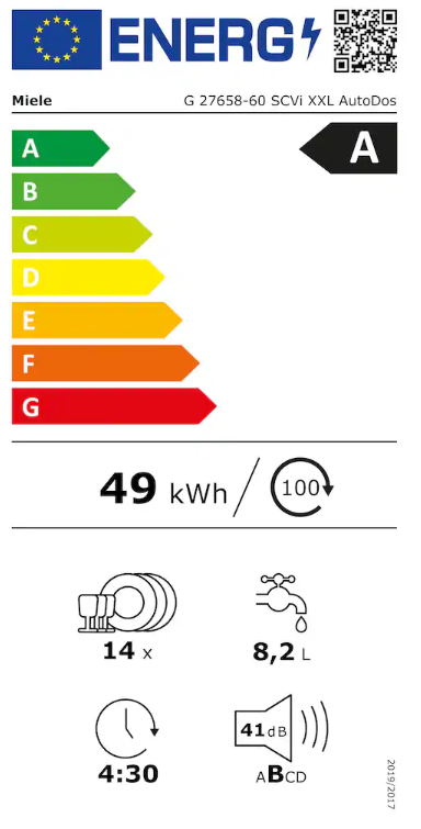 Entièrement intégrable / 14 couv. standard, Softkeys / 1 ligne en texte clair, Dosage automatique avec PowerDisk, QuickPowerWash / Option Quick, AutoOpen, Départ différé jusqu'à 24 h, Miele@home, Tiroir à couverts 3D-MultiFlex, Contrôle de fonctionnement optique et acoustique, Energylabel: A-10%