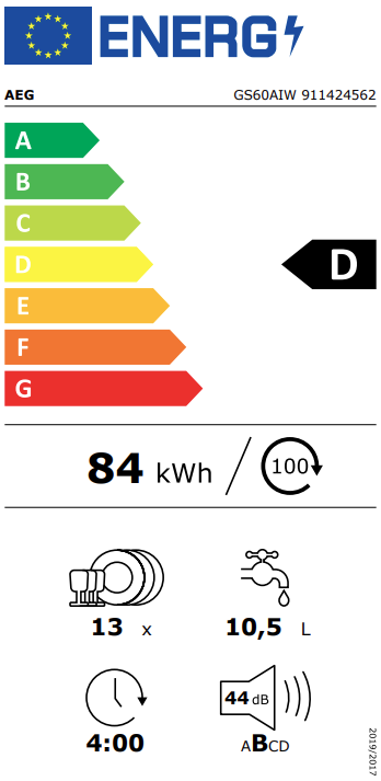 AEG GS60AIW, Lave-vaisselle, intégrable, Blanc, Classe énergétique: D, Niveau sonore dB(A): 44, Capacité (couverts): 13, Nombre de programmes: 8, Tension (V): 230, Norme (cm): 60