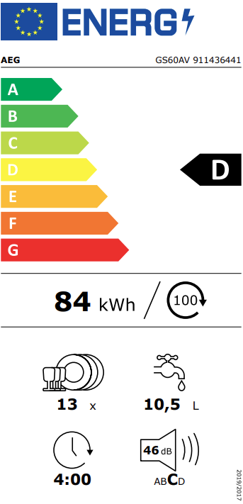 AEG GS60AV, Lave-vaisselle, entièrement intégrable, Noir, Classe énergétique: D, Niveau sonore dB(A): 46, Capacité (couverts): 13, Nombre de programmes: 8, Tension (V): 230, Norme (cm): 60